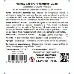 | Dégustation bouche (bouche) | Attaque franche, bouche minérale et soyeuse. Fin de bouche avec des tanins discrets et épicés. |