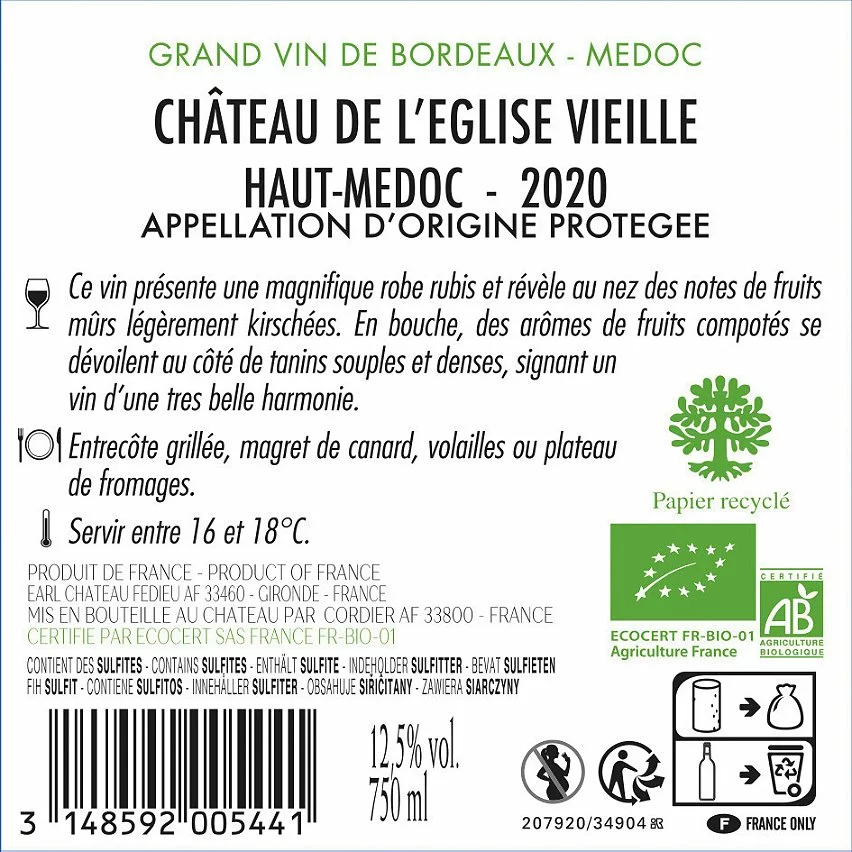 Offres ⭐ Château de l’Eglise Vieille BIO, 2020 – Haut-Médoc AOP – Rouge – 75 cl ????
