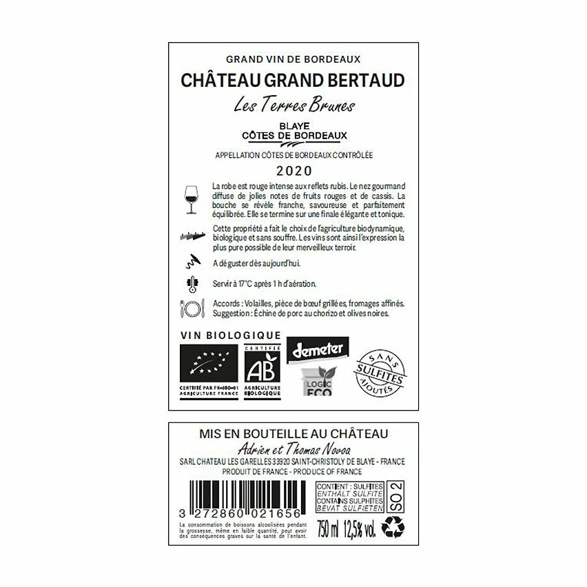 Acheter ???? Château Grand Bertaud Les Terres Brunes BIO, 2020 – Blaye Côtes de Bordeaux AOP – Rouge – 75 cl ????